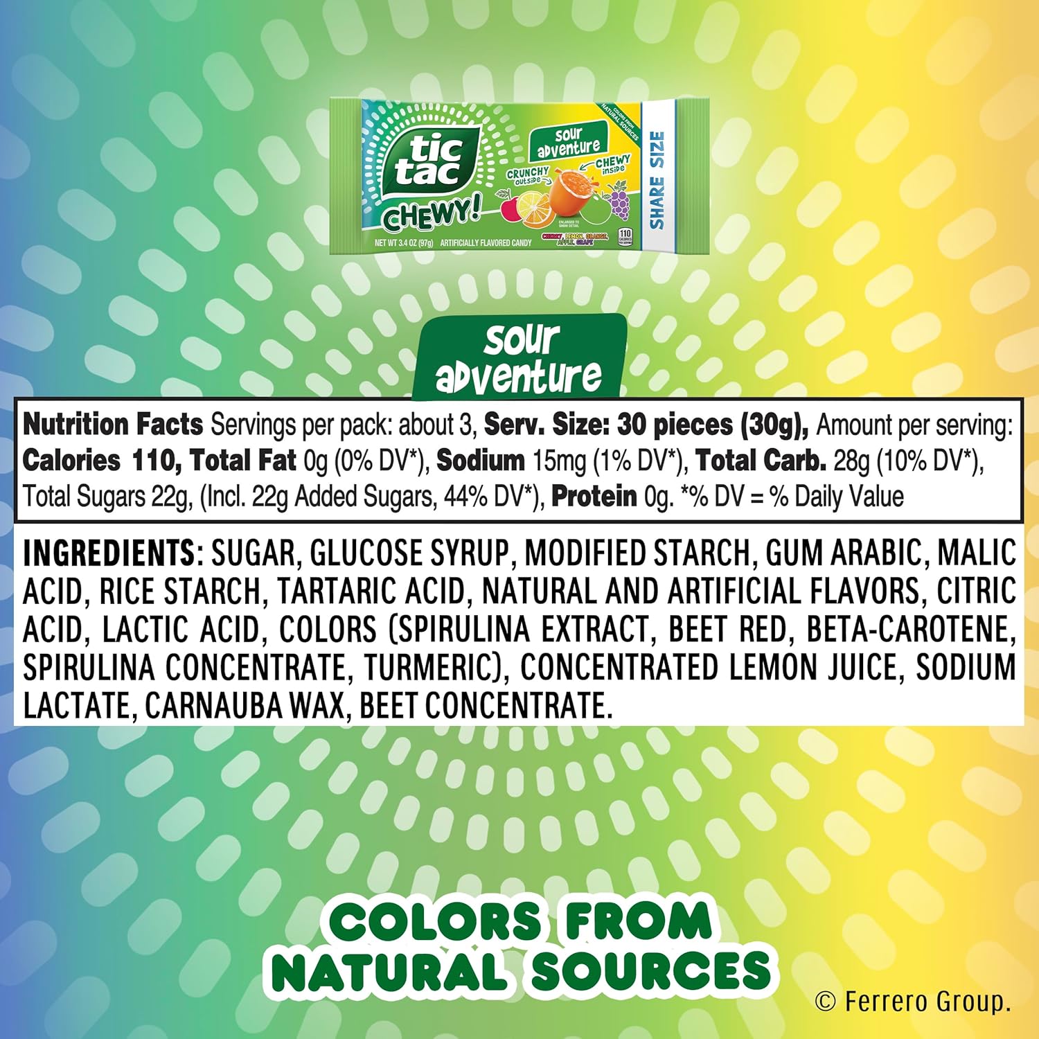 • 8 PACKS OF TIC TAC CHEWY! CANDY: Enjoy the crunchy. chewy deliciousness of TIC TAC CHEWY!??with a crunchy outside and a chewy inside in a Tic Tac-like shape. Including 4 Fruit Adventure and 4 Sour Adventure packs
